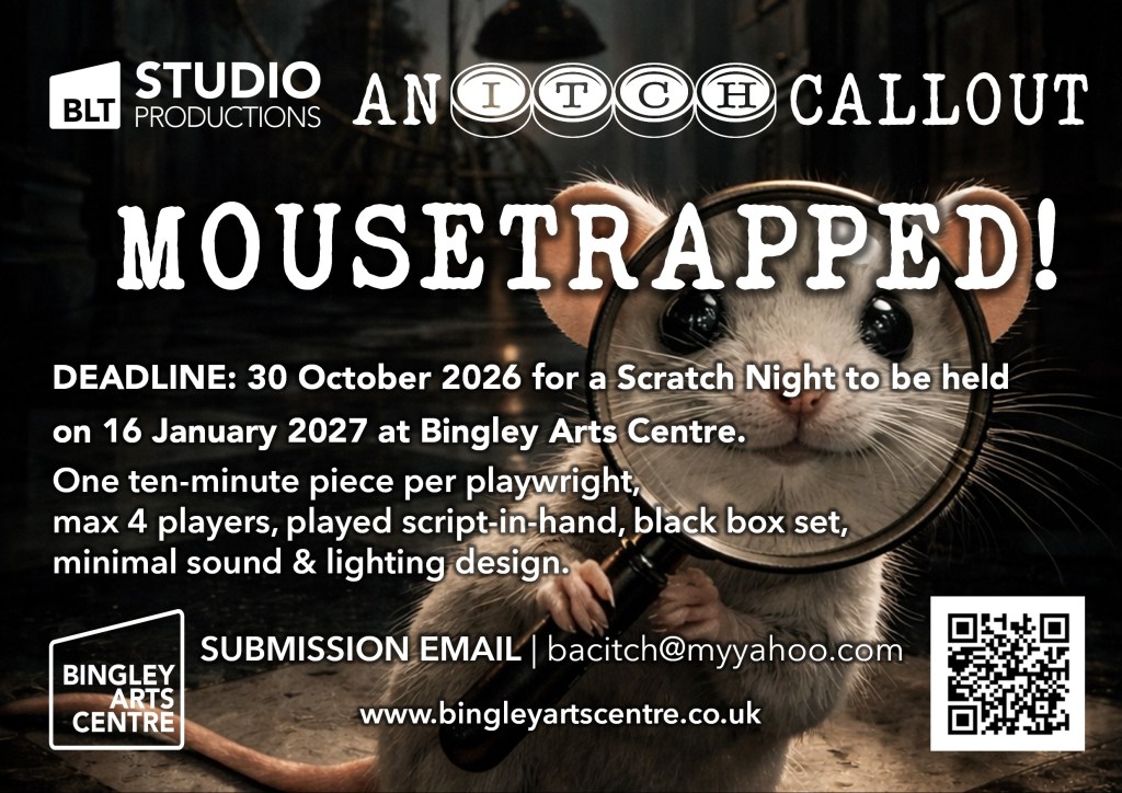 - Playwrights/creatives agree to Bingley Little Theatre performing their material, if selected, in a scratch format and without payment: the scratch format is a research and development opportunity and, as a quid pro quo, the theatre will share all relevant feedback with the writers/creatives.