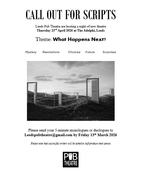 - STAGE – What Happens Next? Monologue and duologue submissions are required for the next Leeds Pub Theatre on Thursday 23rd April 2026. Deadline Friday 13th March 2026 to email scripts here.